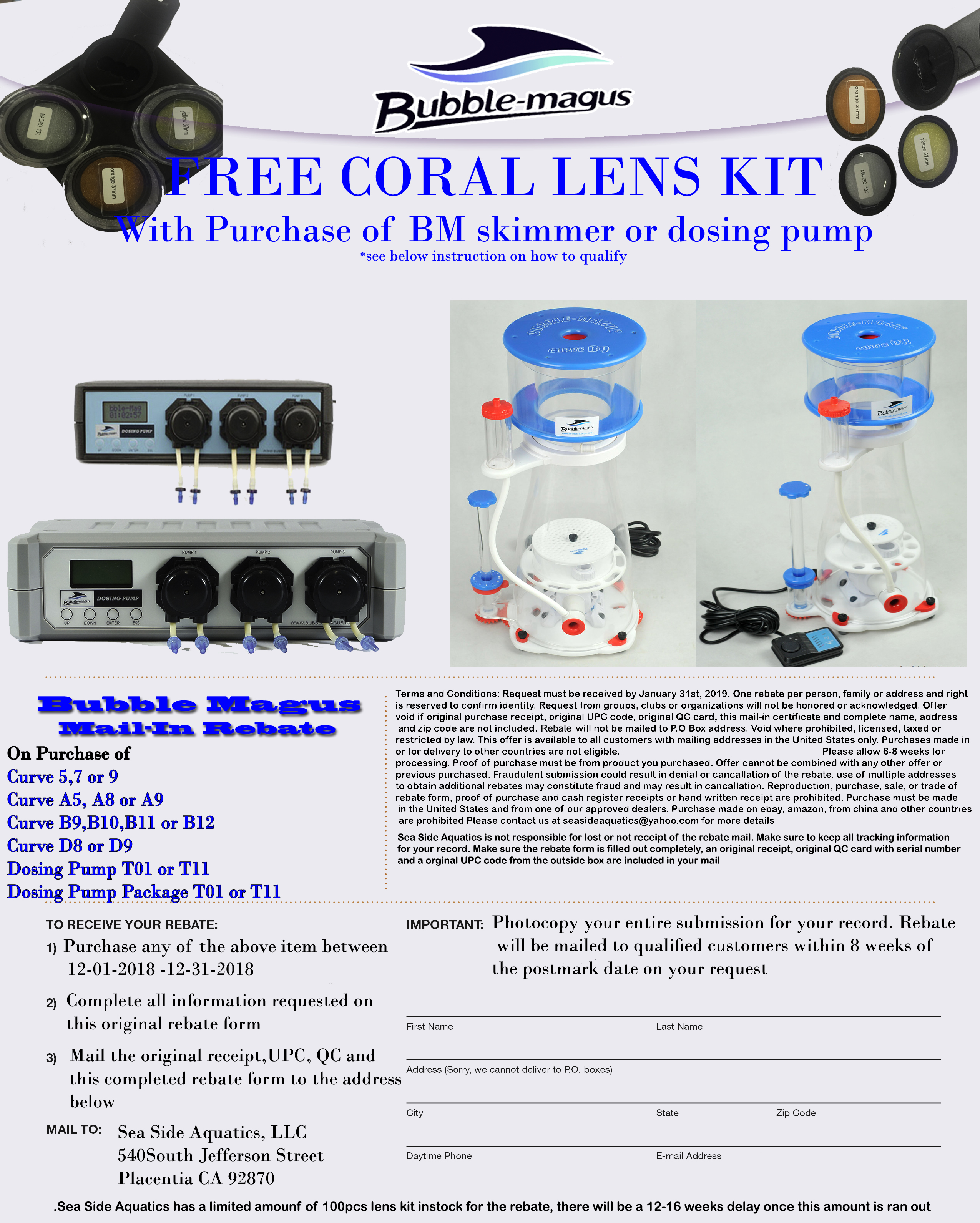 For December of 2018, Sea Side Aquatics is offering FREE Bubble Magus coral lens kit to buyers with purchase of any listed qualified bubble magus items.