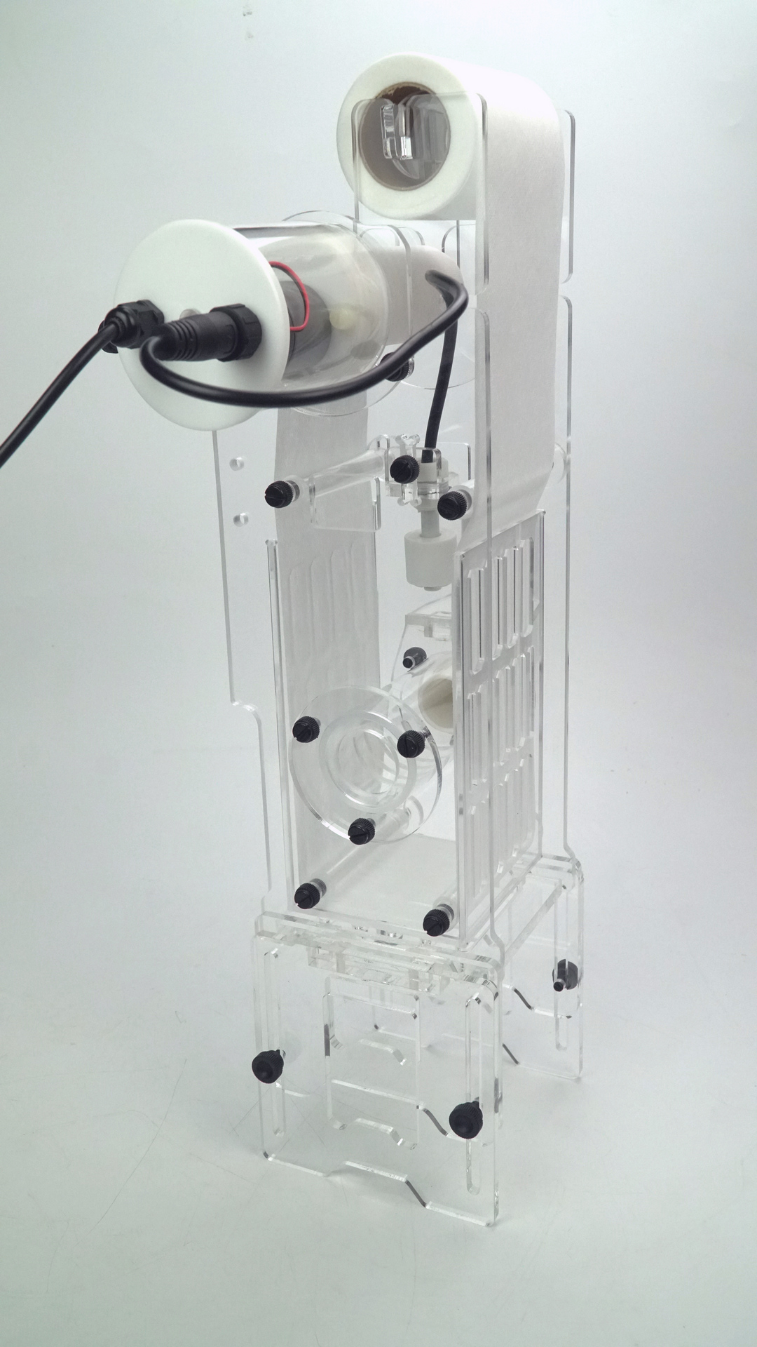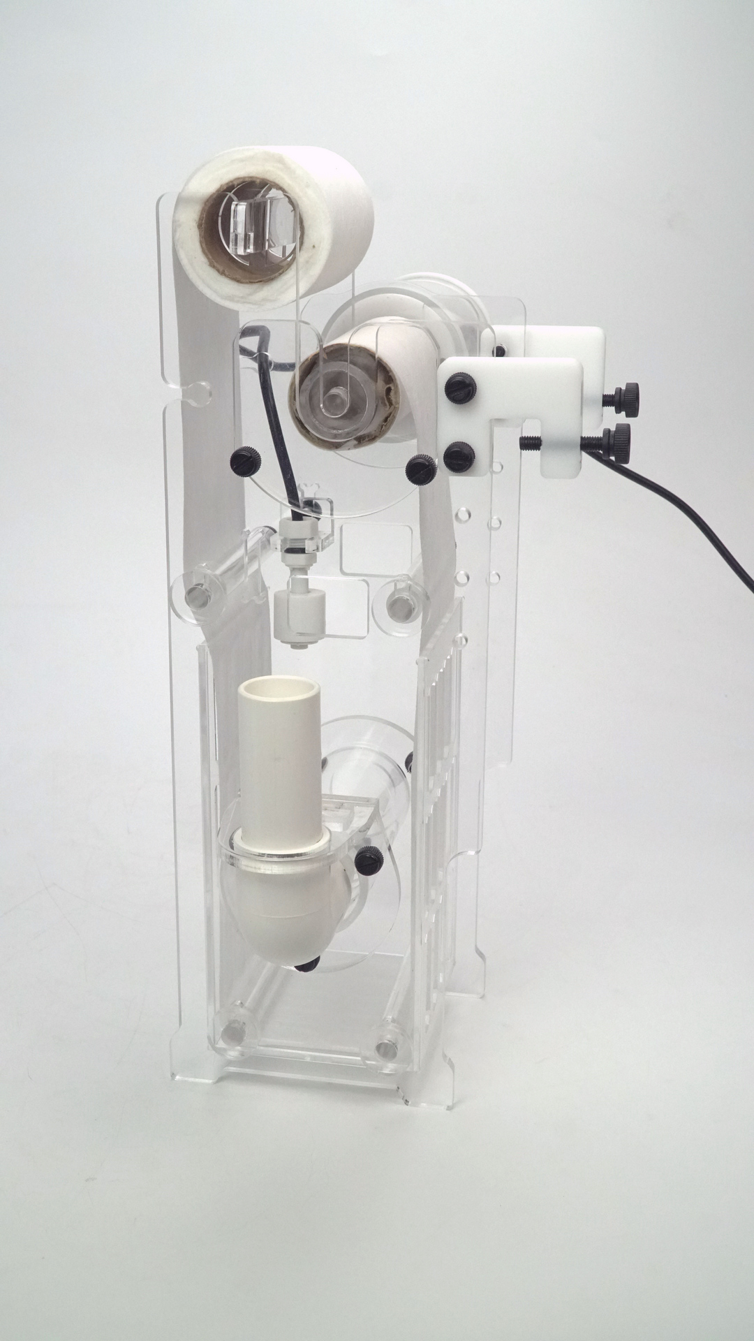 The ARF-S removes the need for filter socks. Water is fed into the internal chamber via the aquarium systems drain, and through the filter roll. When the water level rises in the chamber due to filter clogging the water level switch triggers the motor to wind on the filter roll to a new fresh piece. The water level will then drop repeating the process